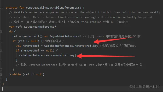 RefWatcher内湖维护了两个集合,在watch调用之后,首先将对象的弱引用添加到集合 watchedReferences 中,延时五秒之后,从队列中获取,如果队列中能查找到引用,说明对象已经被回收,这时将引用对象移动到 retainedReferences 中,暂时标记为泄漏