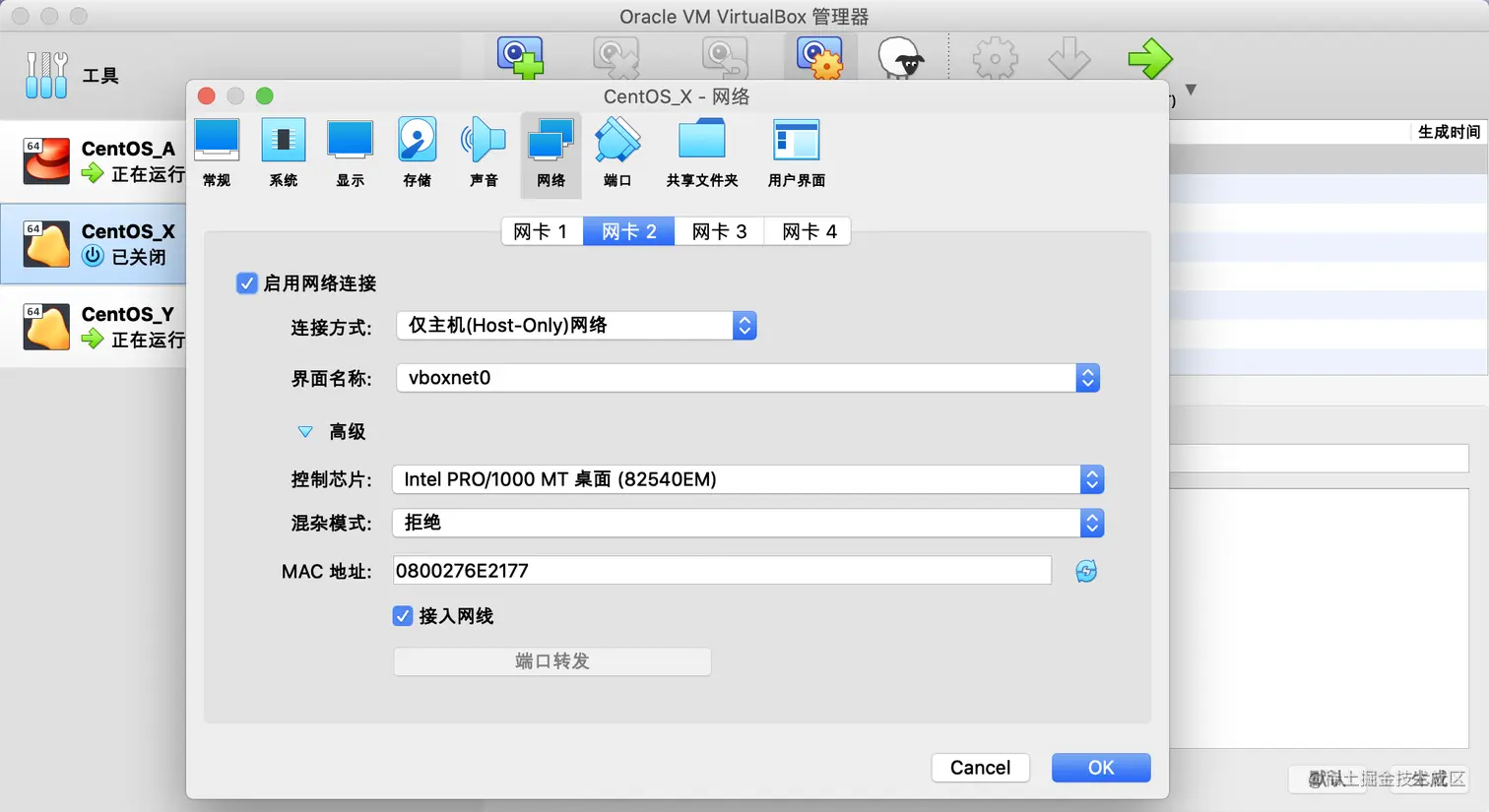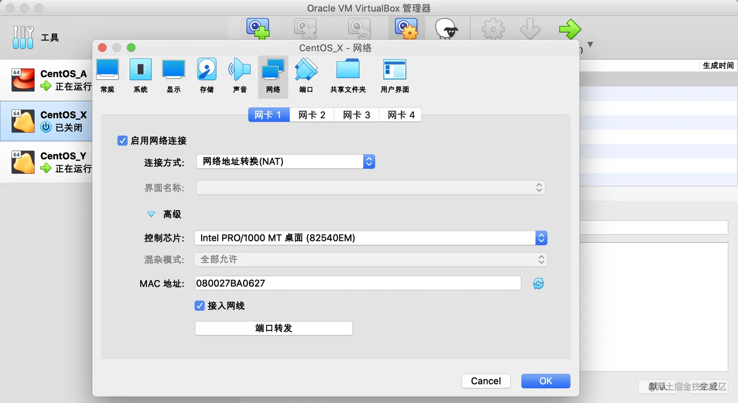 最近在Mac上想用虚拟机搭建一个k8s集群,选用了免费的VirtualBox,默认情况下,在VirtualBox中安装完CentOS分配的是同样的ip,明显不满足我的需求,于是采用了桥接+nat模式可以让不同虚拟机拥有独立的ip,在此记录一下,供参考。