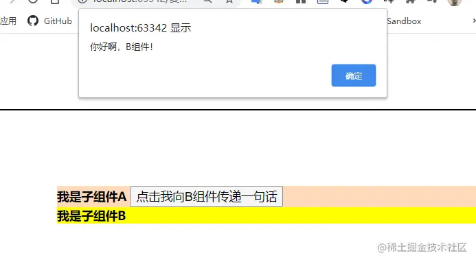 - 第三步:然后在B组件中,Vue实例创建的时候,就要去监听这个lalala事件,然后在这个事件中接收一个参数,这个参数就是传过来的数据