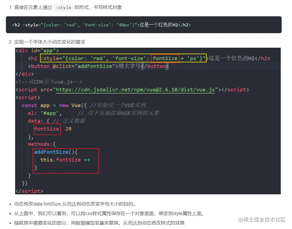 使用 vbind:style (即:style ) 可以给元素绑定内联样式,方法与 :class 类似,也有对象语法和数组语法,看起来很像直接在元素上写 CSS: