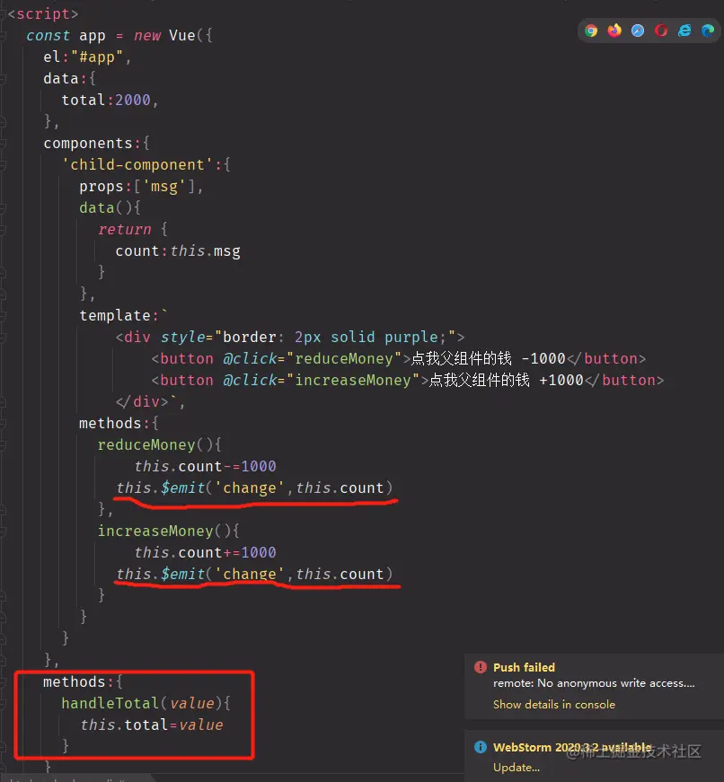 - 第三步:在自定义事件中用一个参数来接受,如上图接收的数据value就是子组件传递过来的count