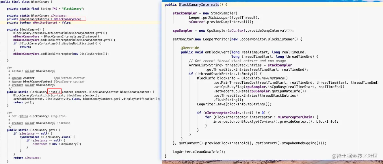 - BlockCanaryInternals是核心类,在onBlockEvent回调中打印了block信息