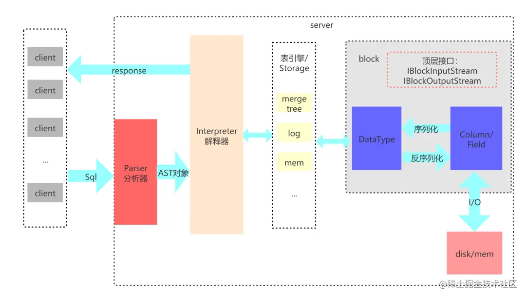 Parser和Interpreter是非常重要的两组接口:Parser分析器是将sql语句已递归的方式形成AST语法树的形式,并且不同类型的sql都会调用不同的parse实现类。而Interpreter解释器则负责解释AST,并进一步创建查询的执行管道。Interpreter解释器的作用就像Service服务层一样,起到串联整个查询过程的作用,它会根据解释器的类型,聚合它所需要的资源。首先它会解析AST对象;然后执行"业务逻辑" ( 例如分支判断、设置参数、调用接口等 );最终返回IBlock对象,以线程的形式建立起一个查询执行管道。