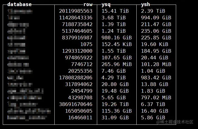 以上数据第一列为库名,第二列为行数,第三列为压缩前大小,第四列为压缩后大小。