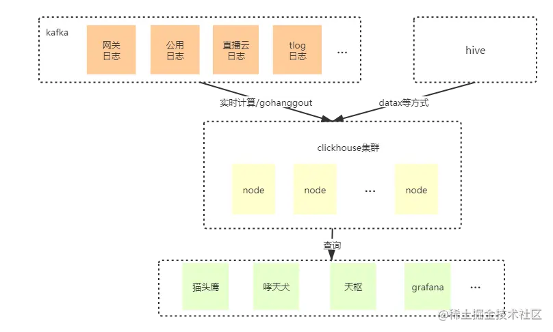 使用方式:我们将需要的数据通过flink,spark,gohangout等工具消费kakfa,写入clickhouse,然后通过clickhouse做聚合查询,将数据展示出来。