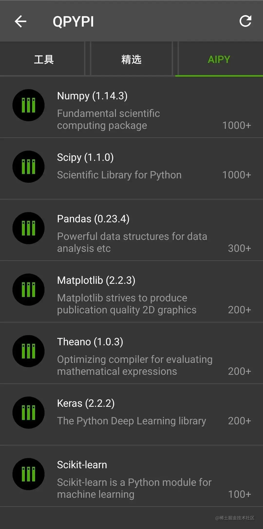 许多手机编程软件不提供第三方库的安装。Qpython支持安装第三方库和工具。