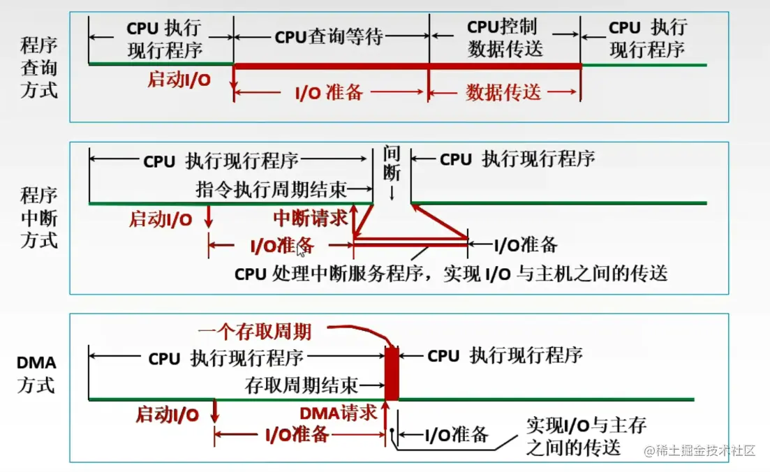 - 中断方式是对I/O准备做出改进,它不需要CPU不断查询来确认外设状态,而是引入了中断机制,在I/O准备好后,通过中断请求通知CPU,而在外设准备阶段,CPU是可以执行原来的主程序,也就是说CPU只参与数据传送阶段。而DMA方式更是将数据传送阶段也给省了,将数据传送的工作交给DMA控制器,使得CPU更加专注于主程序的执行。