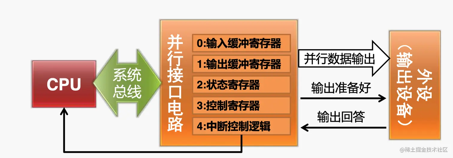 - ③ 接口将数据发到“并行数据输出”信号,并将“输出准备好”信号置为有效(亦可由CPU写控制字将该信号置为有效)