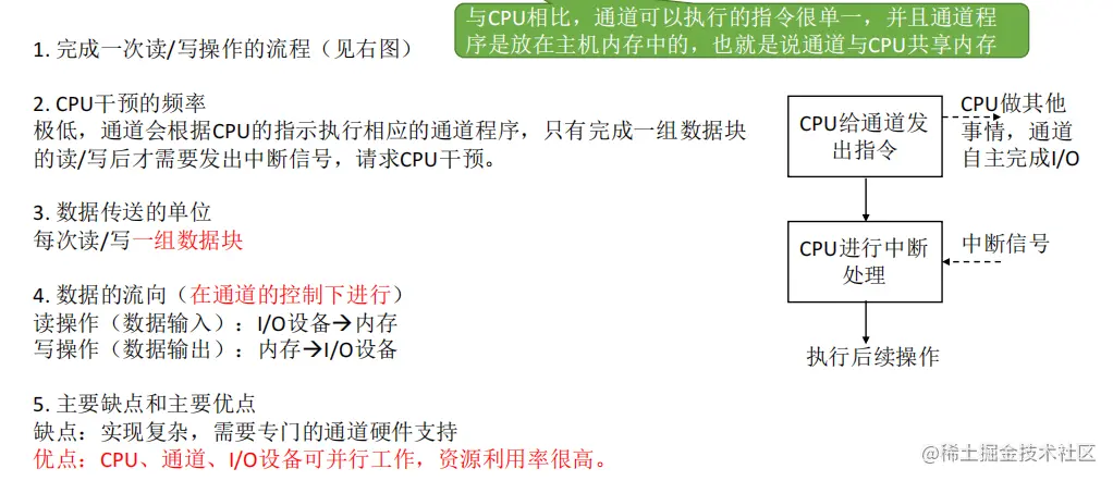 - 通道方式的出现进一步提高了CPU的效率。但需更多的硬件电路。