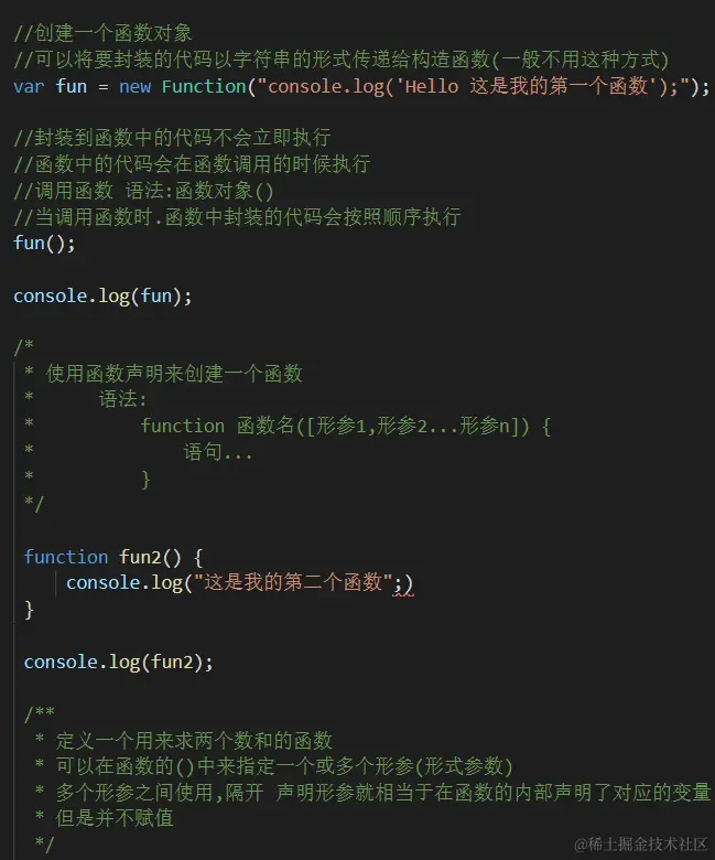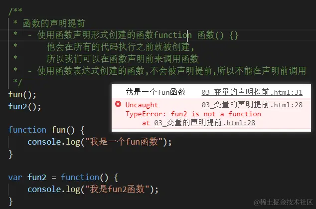 - 使用函数声明形式创建的函数 形如 function 函数(){},他会在所有的代码执行之前就被创建,所以我们可以在函数声明前来调用函数