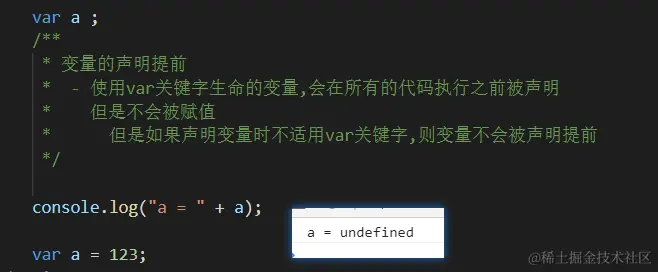 - 使用var关键字声明的变量,会在所有的代码执行之前被声明(但是不会赋值),但是如果声明变量是不适用var关键字,则变量不回被声明提前