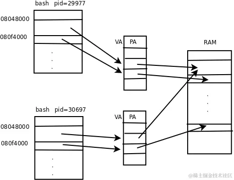 该进程也占用了0x0000 0000-0xbfff ffff的地址空间,Text Segment也是0x0804 8000-0x080f 4000,Data Segment也是0x080f 4000-0x080f 9000,和先前的进程一模一样,因为这些地址是在编译链接时写进/bin/bash这个可执行文件的,两个进程都加载它。这两个进程在同一个系统中同时运行着,它们的Data Segment占用相同的VA,但是两个进程各自干各自的事情,显然Data Segment中的数据应该是不同的,相同的VA怎么会有不同的数据呢?因为它们被映射到不同的PA。如下图所示。