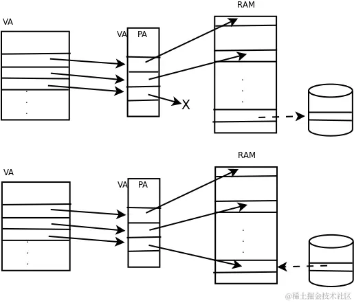 如下图所示。第一张图是换出,将物理页面中的数据保存到磁盘,并解除地址映射,释放物理页面。第二张图是换入,从空闲的物理页面中分配一个,将磁盘暂存的页面加载回内存,并建立地址映射。