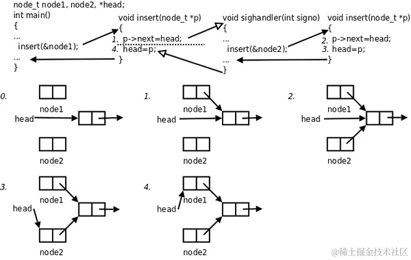 main函数调用insert函数向一个链表head中插入节点node1,插入操作分为两步,刚做完第一步的时候,因为硬件中断使进程切换到内核,再次回用户态之前检查到有信号待处理,于是切换到sighandler函数,sighandler也调用insert函数向同一个链表head中插入节点node2,插入操作的两步都做完之后从sighandler返回内核态,再次回到用户态就从main函数调用的insert函数中继续往下执行,先前做第一步之后被打断,现在继续做完第二步。结果是,main函数和sighandler先后向链表中插入两个节点,而最后只有一个节点真正插入链表中了。
