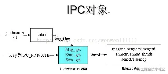 三种IPC:共享内存Shared memory,信号灯semophore、消息队列message queue。 有名管道可以无亲缘关系的进程间通信,是因为用户空间有管道这种文件类型。 而这三种IPC,用户空间是没有对应的文件类型的。ftok key可以保证用户空间的二个进程对同一个IPC对象进程操作。