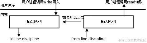 以输入队列为例,从键盘输入的字符经线路规程过滤后进入输入队列,用户程序以先进先出的顺序从队列中读取字符,一般情况下,当输入队列满的时候再输入字符会丢失,同时系统会响铃警报。终端可以配置成回显(Echo)模式,在这种模式下,输入队列中的每个字符既送给用户程序也送给输出队列,因此我们在命令行键入字符时,该字符不仅可以被程序读取,我们也可以同时在屏幕上看到该字符的回显。