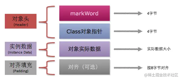 - 对象头(object header):8 个字节(保存对象的 class 信息、ID、在虚拟机中的状态)