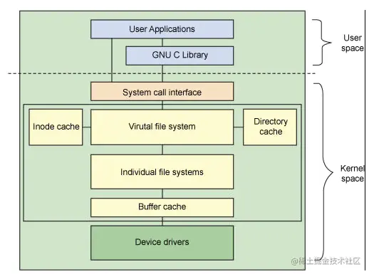 - VFS 是底层文件系统的主要接口,它是 Linux 内核中的一个软件抽象层。这个组件导出一组接口,然后将它们抽象到各个文件系统,各个文件系统的行为可能差异很大。有两个针对文件系统对象的缓存(inode 和 dentry)。它们缓存最近使用过的文件系统对象。