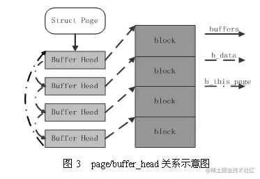 Page 结构和 buffer_head 数据结构的关系如下图所示。Page指向一组Buffer的头指针,Buffer的头指针指向磁盘块。在这两个图中,假定了 Page 的大小是 4K,磁盘块的大小是 1K。