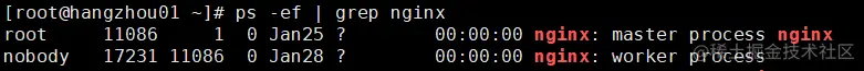 主进程id为11086,所属root用户;工作进程id为16600,所属nobody用户;