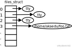 每个进程在Linux内核中都有一个task_struct结构体来维护进程相关的信息,称为进程描述符(Process Descriptor),而在操作系统理论中称为进程控制块(PCB,Process Control Block)。task_struct中有一个指针指向files_struct结构体,称为文件描述符表,其中每个表项包含一个指向已打开的文件的指针,如下图所示。
