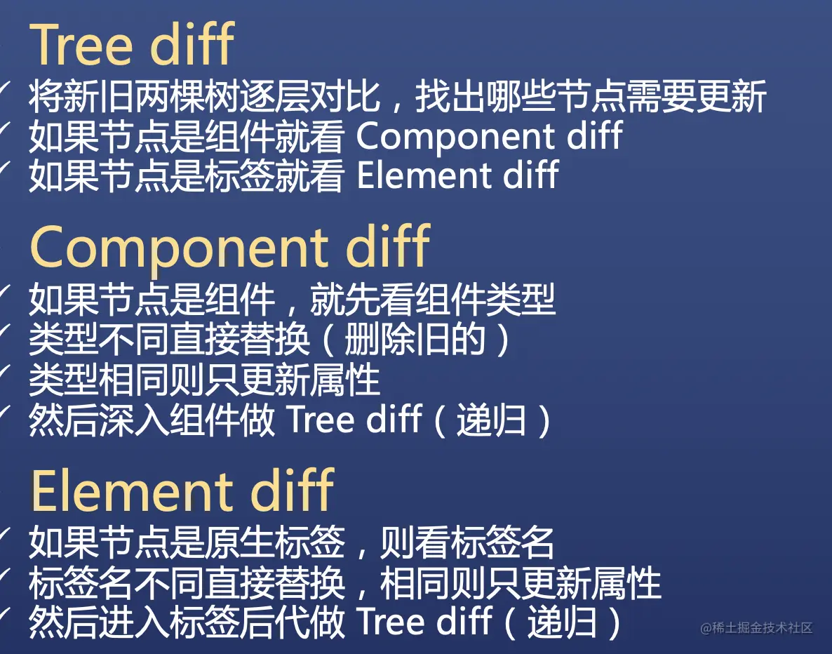 简单来讲就是在一棵dom树上的每一个节点做比较,如果是类型不同就替换,如果属性不同就更新,但是如果一个节点进行替换了,就不会再往深去做diff操作了,这在一定程度上也牺牲了一定的精确度,复杂了为O(n)