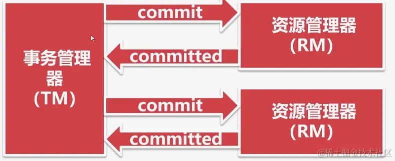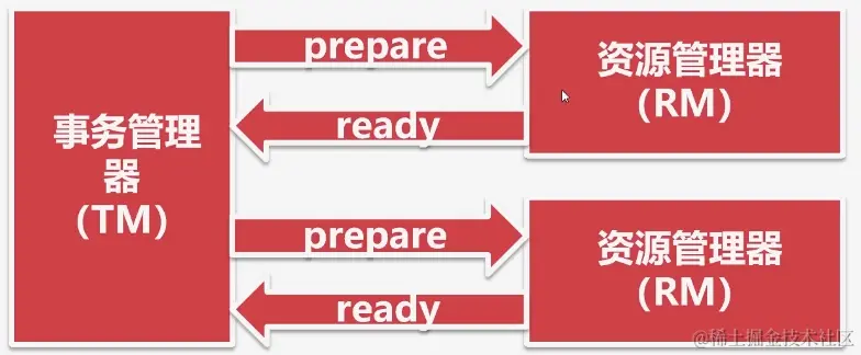 左边是一个事务管理器TM,右边是资源管理器RM。第一阶段,事务管理器先向资源管理器发送准备要求。如果资源管理器可以准备好,就向事务管理器发送ready。如果准备失败,事务管理器则会进行回滚。