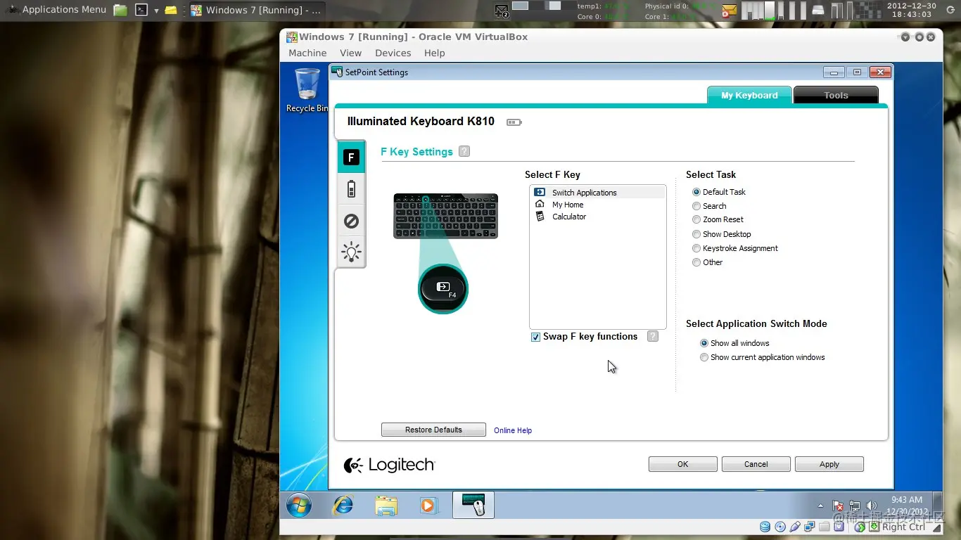 购买后我发现,默认的配置是使用F键直接按键的扩展功能。为了使用常规的F键,用户必须另外按住FN键。由于我想主要在普通PC上使用键盘,我无法忍受。幸运的是,罗技为微软Windows系统提供了一个名为 "SetPoint "的鼠标和键盘配置工具。