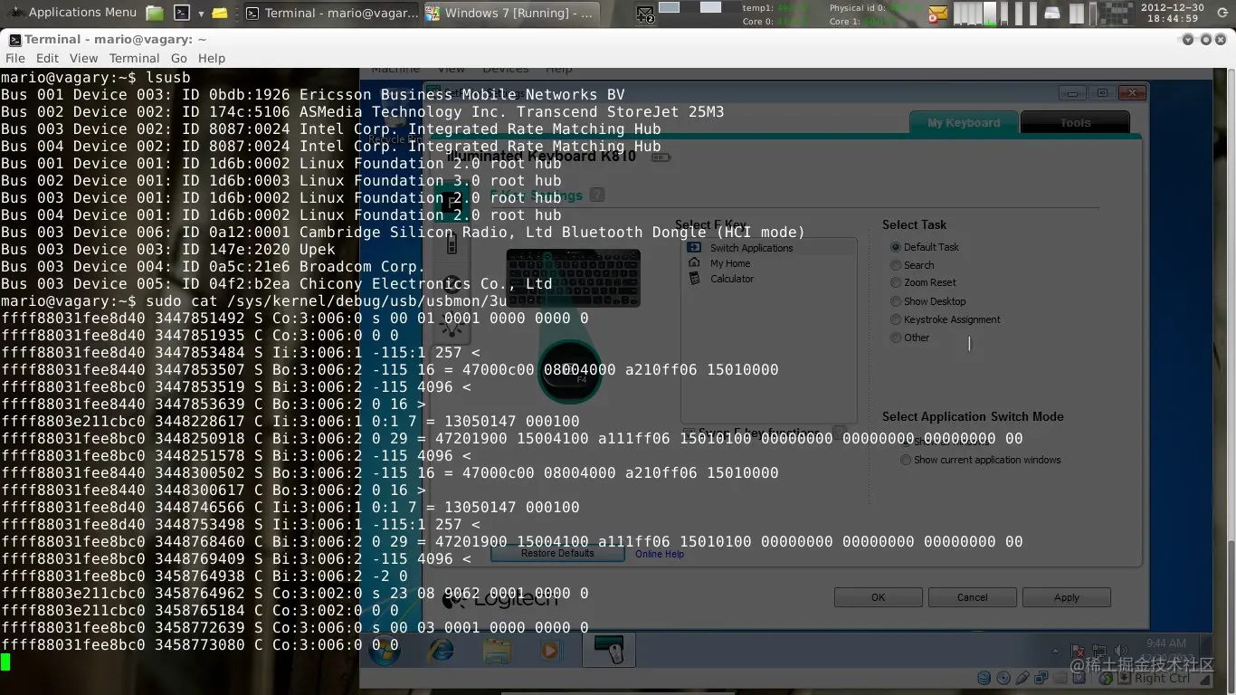 然而,当我发现配置并不是永久存储在键盘中,而是必须在每次打开键盘时发送时,我感到很失望。由于我更喜欢使用Linux作为操作系统,并且不使用微软Windows,所以我无法使用罗技的软件。我分析了与HID设备的通信,并创建了一个小软件来发送配置信息到键盘。为了追踪蓝牙信息,我在VirtualBox环境中执行SetPoint。虚拟机可以通过一个蓝牙USB加密狗连接到键盘上。在Linux主机上,我加载了usbmon内核模块,以便追踪USB层的所有信息到CSR蓝牙芯片。