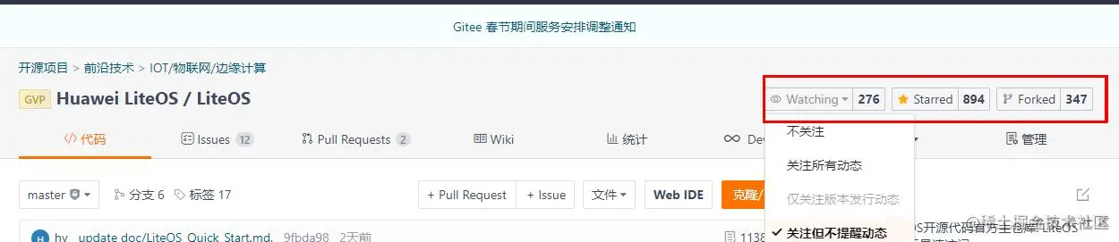 感谢阅读,如有任何问题、建议,都可以留言给我们: gitee.com/LiteOS/Lite… 。为了更容易找到LiteOS代码仓,建议访问 gitee.com/LiteOS/Lite… ,关注Watch、点赞Star、并Fork到自己账户下,如下图,谢谢。