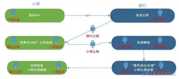引用知乎上面的一个案例就是:小明使用银行的公钥加密了“我要存5000元”的信息,发送给了银行,如果中间被截取了这个信息吗,由于没有私钥,是没办法进行篡改和解密的,银行收到信息后,将信息进行解密后进行操作,然后将“操作成功/失败”的信息用小明的公钥进行加密后发送给小明,小明收到信息用自己的私钥进行解密操作。