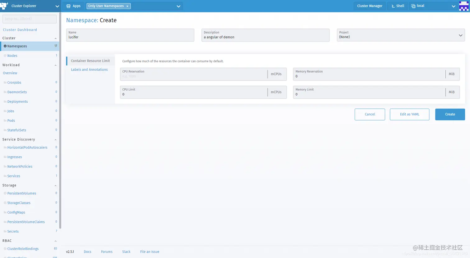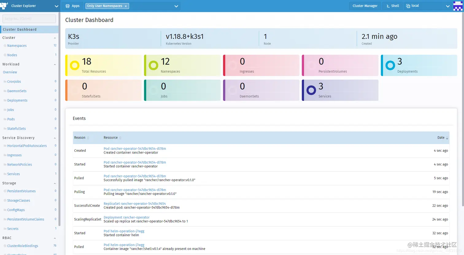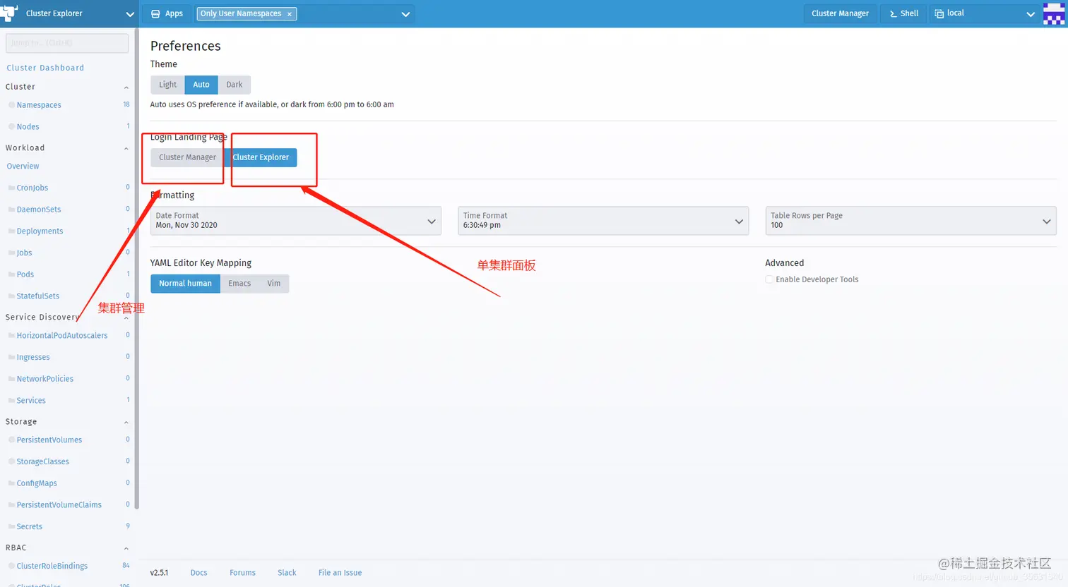 可以看到整个系统还没有做国际化,没有切换语言的功能。 点击右上角的Cluster Manger 可以到达旧版的UI,进行多集群管理。也可以在用户设置那里进行设置,登录后前往那个页面