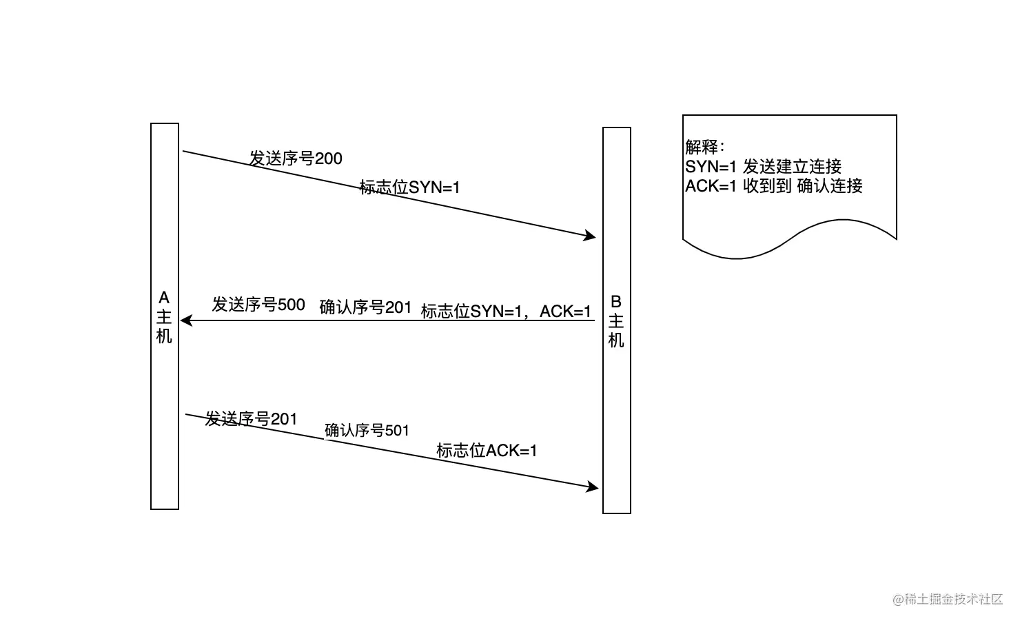 A->B 我收到啦,你发送的序号是500,,我在此基础上给你加一,确认序号是501,我的序号需要执行加一,是201。作用:客户端接收没有问题,发送没有问题 整个流程下来可以确保客户端,服务器发送接收都没有问题