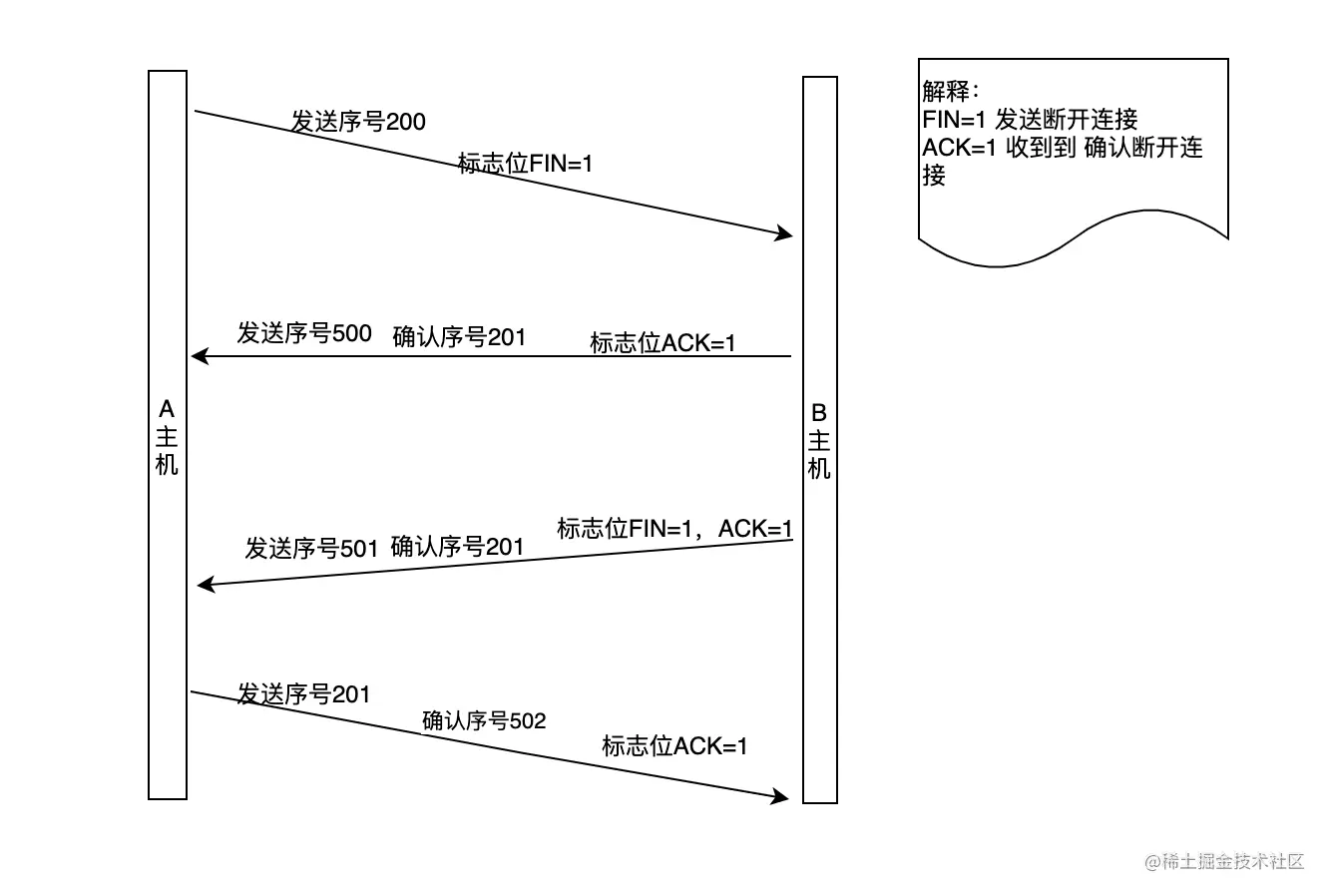 - B->A 我所有的报文已经执行完了,我要跟你断开连接, 我的序号是501,你发送的序号是200,我在此基础上给你加一,确认序号是201,你能收到吗?B处于LAST_ACK (最后确认)的状态,只需等待A反馈即可
