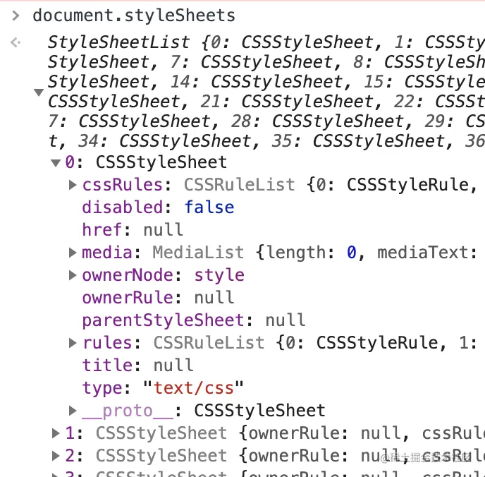 浏览器是无法直接识别css样式的,因此渲染引擎收到css文本时,首先生成一个样式对象 styleSheet,可以通过document.styleSheets查看该结构 ![]