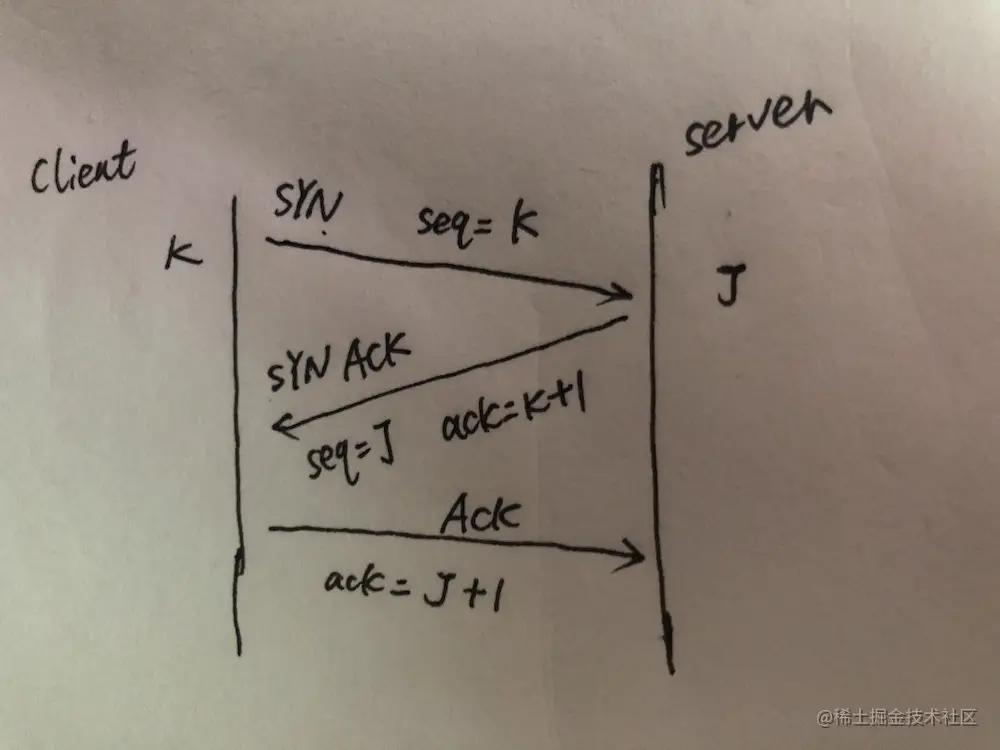 2: server收到了客户端的连接请求。那么会针对这个请求会回一个确认,并且自己也会发送一个syn请求,seq也是随便的,设置为J。报文如下: SYN(这个是标志位)=1 ACK(这个是标志位,表示这是一确认报文)=1 SEQ=J, ack(这个是确认号)=k+1(对你给我的报文k进行确认),这个地方的ACK和ack不要搞混淆了。