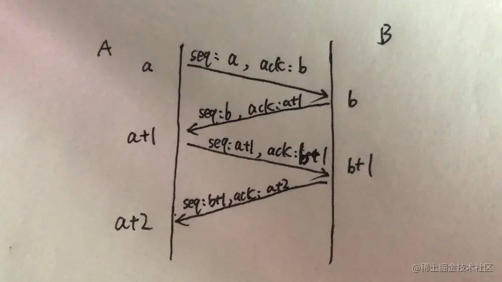 是希望获得的下一条报文的序号,这个一定要理解。举个例子:A和B建立连接之后,假如当前A发送一条报文给B,报文如:seq=a,ack=b,表示我当前的报文的序号是a,我希望你给我发的下一条报文的序号是b,那么B针对这条报文的回复报文就是:seq=b,ack=a+1,表示我当前的报文序号是b,我希望你给我发送的下一条报文是a+1.接着A发给B的下一条报文为:seq:a+1,ack=b+1,如下图
