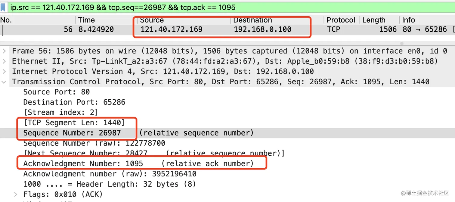NSEQ=28427(28427=26987+1440),这个就是我下一条报文的序号,其实我自己能够知道我下一条报文的序号,也就是为什么接受端有可能先接受的是后面的报文,因为只要我的最开始的序号确定了,所有报文的序号其实已经确认了。