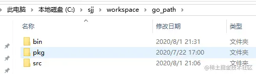 一般来说GOPATH下面会有三个文件夹:bin、pkg、src,没有的话自己创建。每个文件夹都有其的作用。