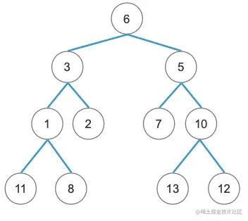 1、6 -> 3 > 1 > 11 > 8 > 2 > 5 > 7 > 10 > 13 > 12,第一个是6,所以6是这颗主树的根节点,那么这个时候我们可以拿根结点去中序遍历中找,11 > 1 > 8 > 3 > 2 > 6 > 7 > 5 > 13 > 10 > 12,那么6的左边就是左子树的中序遍历,右边就是右子树的中序遍历。