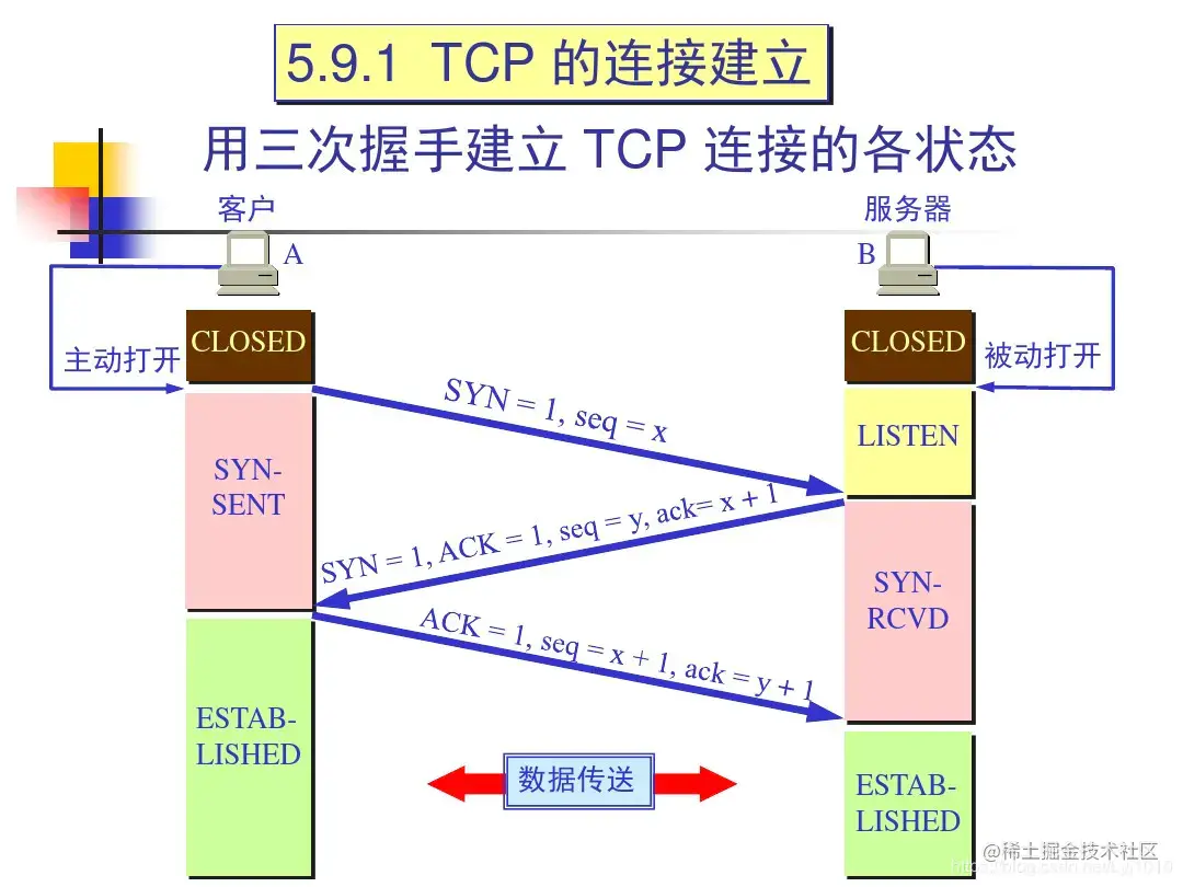 - 第三次握手:客户端收到服务器的确认后,还要向服务器给出确认。确认报文段的 ACK 置为 1 ,确认号 ack = y + 1,而自己的序号 seq = x + 1 。这时, TCP 连接已经建立,客户端进入 ESTABLISHED (已建立连接) 状态。当 服务器 收到 客户端 的确认后,也进入 ESTABLISHED (已建立连接) 状态。