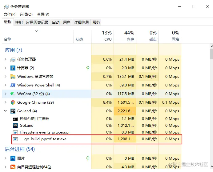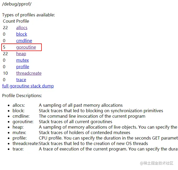 代码中监听了 8090 端口,在浏览器中输入 http://127.0.0.1:8090/debug/pprof/