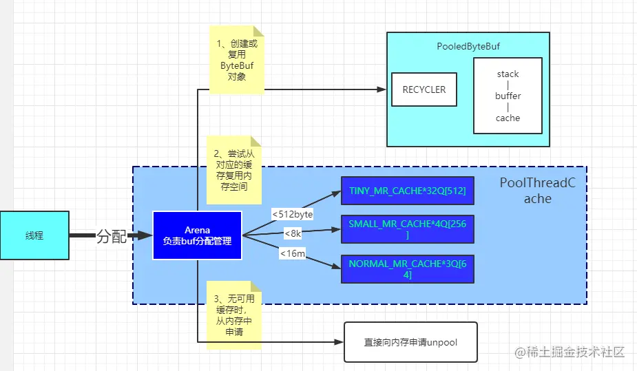 每个线程都有一个对应的PoolThreadCache,里面有一个Arena负责buf的分配管理。先拿一个ByteBuf对象。从可复用对象池RECYCLER里面拿一个ByteBuf,若没有则创建。拿到对象之后就要为之分配内存。每一个线程在对应的缓冲中维护了三大块内存缓存,如果要存放一个小于512byte的数据, 就回到对应的缓存块。