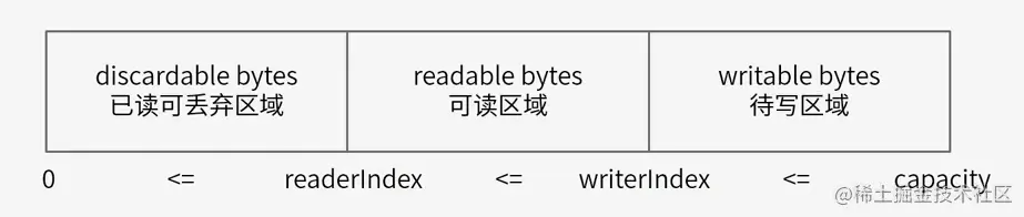 capacity表示是容量。readerIndex指针左边的是已读可丢弃的区域,表示已经读取过一遍,可以丢弃了。而readerIndex和writerIndex指针之间的是可读区域。writerIndex右边的则是尚未被写入的待写区域。