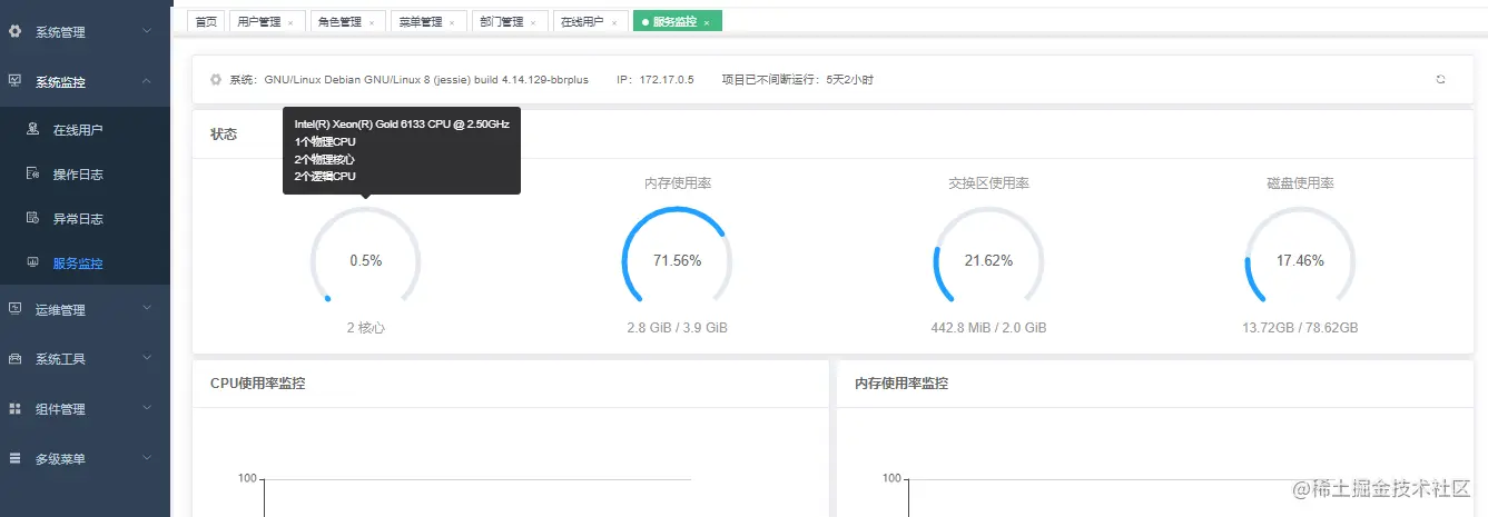 支持在线用户管理与服务器性能监控,支持限制单用户登录