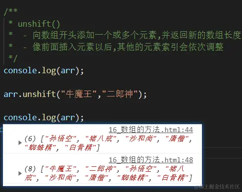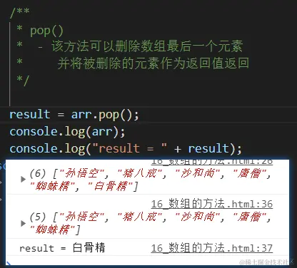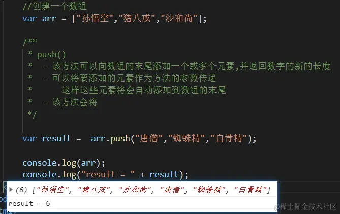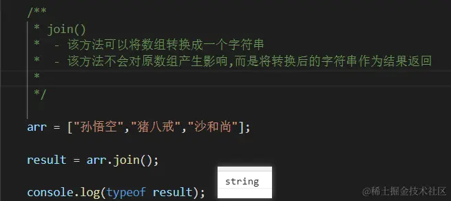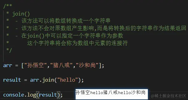 - 在join()中可以指定一个字符串作为参数,这个字符串将会称为数组中元素的连接符,如果不指定连接符,则默认使用逗号(,)作为连接符