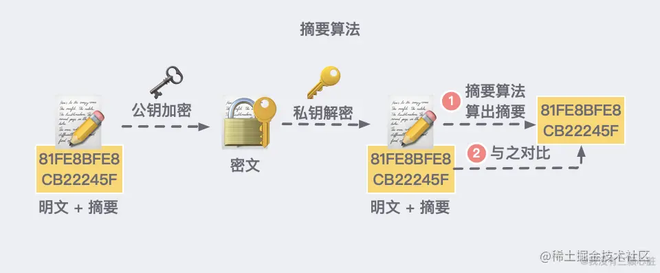 服务器解密后,用相同的摘要算法算出发送过来的明文,通过比较客户端携带的 「指纹」 和当前算出的 「指纹」 做比较,若 「指纹」 相同,说明数据是完整的。
