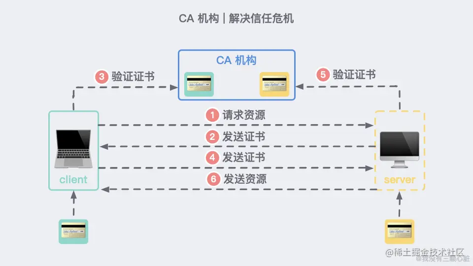 这个可信的组织就是颁发 HTTPS 证书的组织 CA(Certificate Authority)。每次有客户端或者服务端想要公开自己的公钥时,都需要向 CA 做出申请,通过后 CA 会颁发一个与公开公钥绑定的数字证书。(了解更多证书)