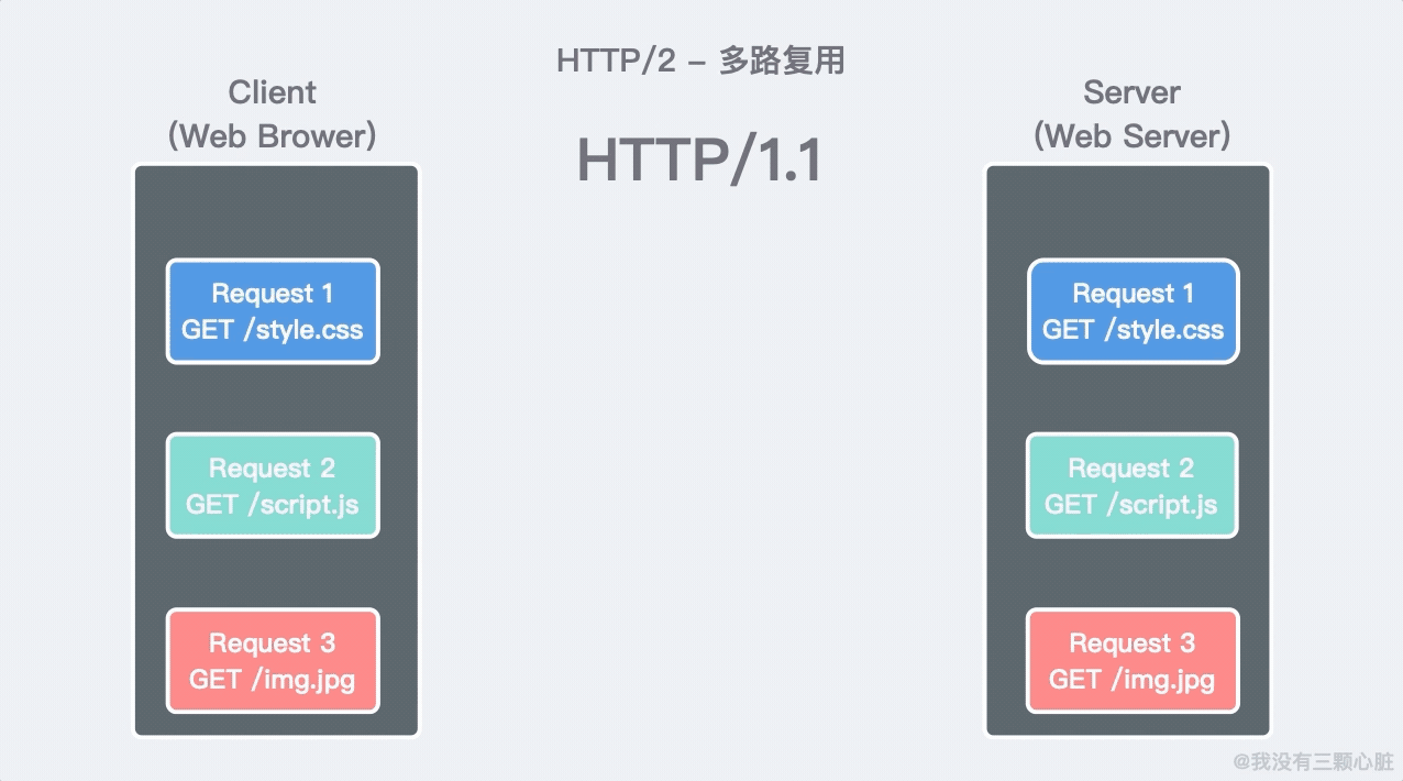 *注:这里 HTTP/2 并不是合并成一个包,而是分成多个 Stream 发送,这里只是为了绘画方便。