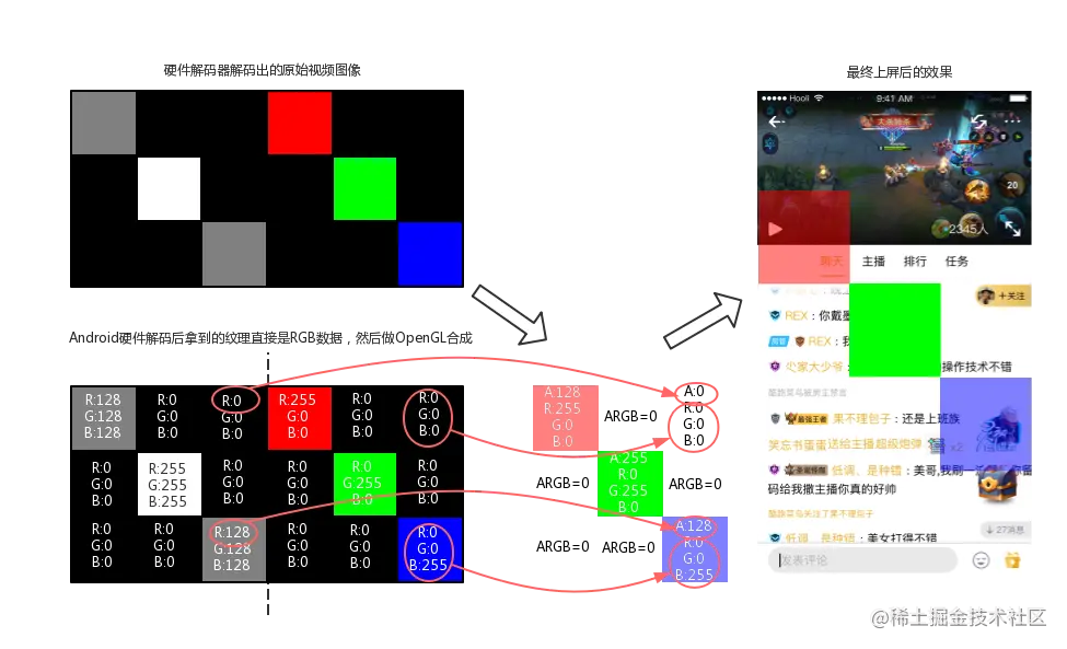 H264解码出来每一帧的数据是YUV,转换为RGB后是不带Alpha通道的,而我们可以在视频中额外开辟一块区域,在RGB通道里存储Alpha的值,最后利用OpenGL将这些数据合成为ARGB图像(带透明通道的图像)。